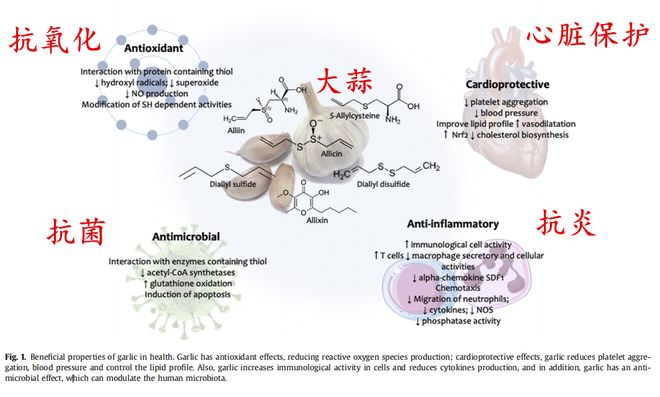 大蒜中的含硫化合物,健康特性得到了证实,具有抗炎、抗氧化、抗菌、免疫调节、改善脂和糖代谢、保护心脏、保护肝脏的作用。