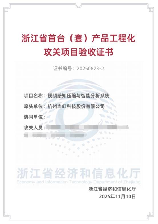 近日,当虹科技视频感知压缩与智能分析系统,入选浙江省经济和信息化厅、浙江省财政厅公布的2025年度浙江省首台(套)装备名单,成为该名单中唯一认定的视频压缩类产品。